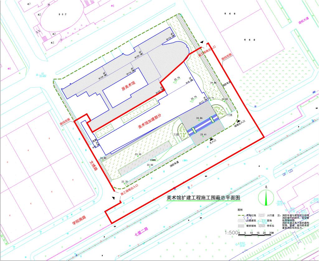 美术馆扩建工程选址在美术楼南侧,扩建总建筑面积约3239平方米,框架三层混凝土结构,包括多功能厅、美术课室等,并对现有停车场及周边绿化进行改造。该工程计划于2020年10月2日进场施工围蔽(见施工围蔽平面图),工期约七个月,围蔽施工期间给师生带来的不便敬请谅解。请大家根据现场交通指引通行,切勿进入施工现场。
