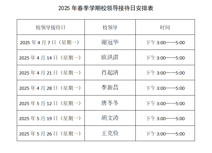请有意来访的师生员工于校领导接待日的前一周周五下午17:00前填写附件1-《万象城娱乐awc线路校领导接待日预约登记表》并发送至电子邮箱xxdb@zqu.edu.cn进行预约,党政办公室协调安排后,将通知预约人具体接待时间。