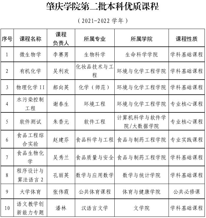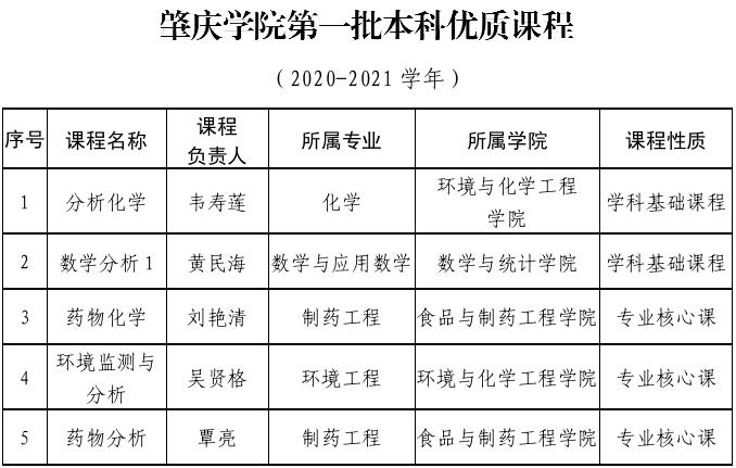 本网讯 根据《关于印发万象城娱乐awc线路本科课程评估方案(试行)的通知》(肇学院〔2019〕34 号)精神,我校本科课程评估工作经过二级学院自评打分、督导听课看课、专家评价等环节,最终评定韦寿莲等5位教师的课程为万象城娱乐awc线路第一批本科优质课程,李赛男等10位教师的课程为万象城娱乐awc线路第二批本科优质课程,具体名单如下: