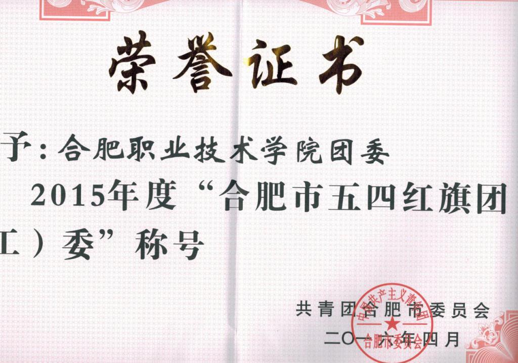 近日,共青团合肥市委员会印发了关于表彰2015年度合肥市“五四红旗团(工)委”、“优秀共青团干部”、“优秀共青团员”的决定。我院团委荣获“2015年度合肥市五四红旗团委”、“2015年度合肥市目标管理考核优秀单位”,团委书记佘海月、团委副书记王克勇荣获“2015年度合肥市优秀共青团干部”荣誉称号,高坤杨等六位同学荣获“2015年度合肥市优秀共青团员”荣誉称号。
