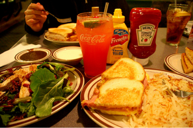 面包、汉堡、三明治、甜甜圈、青菜叶、黄油、奶酪、沙拉酱、冰淇淋、咖啡,搭配大块烤牛肉、烤火鸡,这些基本概况了这里所有吃的内容,然而高热量高脂肪多甜腻多生冷的饮食实在不是我们中国人的菜啊!