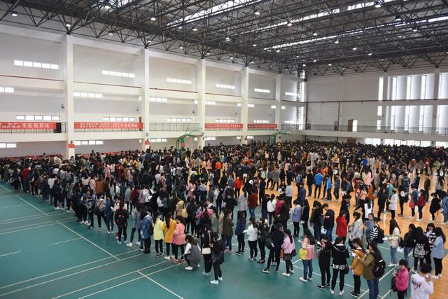 体育馆外,报名的考生排成一条长龙,井然有序地等候着报名。