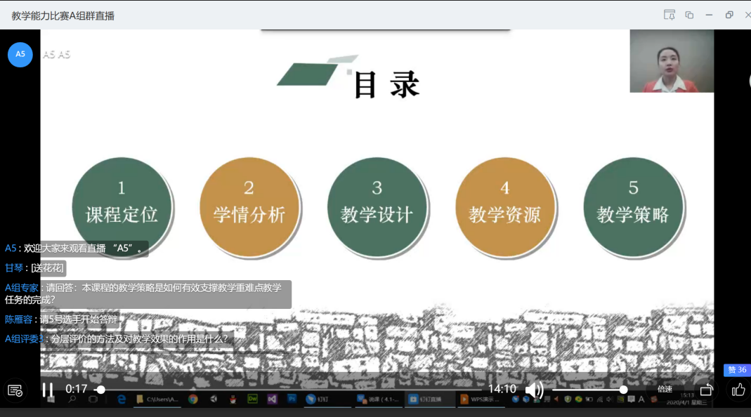 杏花春雨时,杨柳和风季。4月1日,伟德官网2020年教学能力比赛决赛,采用钉钉平台在线直播形式,圆满落下帷幕。本次比赛由教务处教师能力发展中心承办,现教中心协办。安徽省职业院校信息化教学指导专家组秘书长段文忠等6位校外专家应邀担任评委,校领导、各二级学院负责人和全体专兼职教师同时在线观摩了比赛。