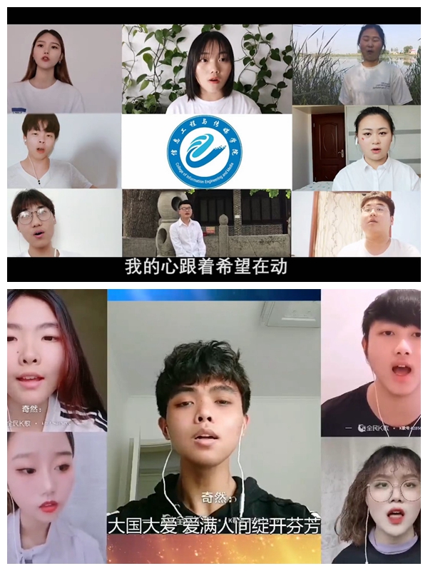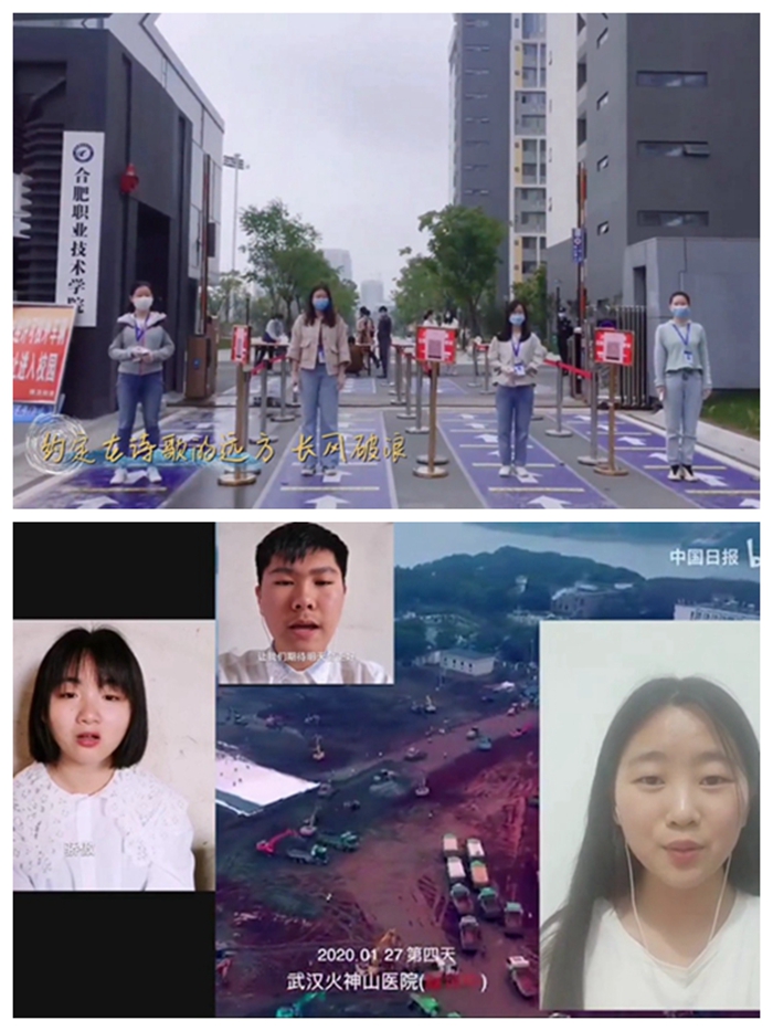 建筑工程学院的《明天会更好》,信息工程与传媒学院的《我的未来不是梦》,医学院--《大国大爱》,轨道交通学院--《我的梦》,生物工程学院--《奔跑》,经贸旅游学院--《星辰大海》,汽车工程学院--《明天会更好》,护理学院--《白衣城墙》……一首首赞歌流露出合职学子对祖国的祝福之情,对医护人员的敬佩之情。
