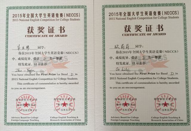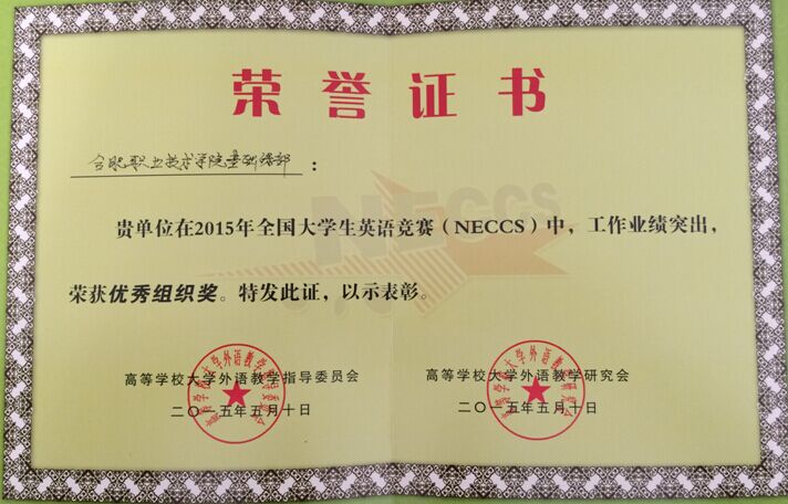 2015年全国大学生英语竞赛安徽赛区比赛已完成阅卷及评分工作。最终,我院选拔的朱亚琴、欧莉莉两名同学获得安徽赛区一等奖,基础部英语教研室张玉蓉和刘靓两位老师获得优秀指导教师称号,基础部荣获组委会颁发的优秀组织奖。此次获奖,是院领导及相关部门的大力支持和指导教师辛勤的培养以及学生扎实训练的结果。