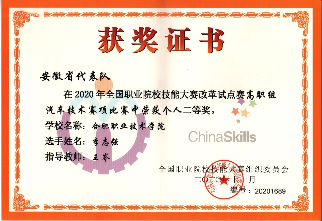 11月8日至9日,2020年全国职业院校技能大赛改革试点赛汽车技术赛项在山东交通职业学院举办,全国共有30个省代表队参赛,伟德官网李志强同学代表安徽省参赛,经过两天的激烈角逐,伟德官网取得全国第五名、李志强同学荣获个人二等奖的好成绩。