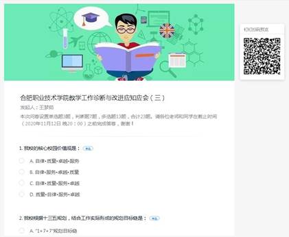 自伟德官网开展教学诊断与改进复核相关工作以来,为了持续普及教学诊断与改进的相关知识,建立“人人知晓,人人参与”的诊改意识和质量文化,诊断与改进工作办公室在前两次全校范围应知应会测试的基础上,于11月6日在钉钉上发布了《教学工作诊断与改进应知应会(三)》问卷作答活动(11.6-11.12),再次组织全校所有教职工和在校学生参与问卷作答。本次问卷共23题,题型分为单选题、判断题以及多选题,其中单选题3题,判断题7题,不定项多选题13题。
