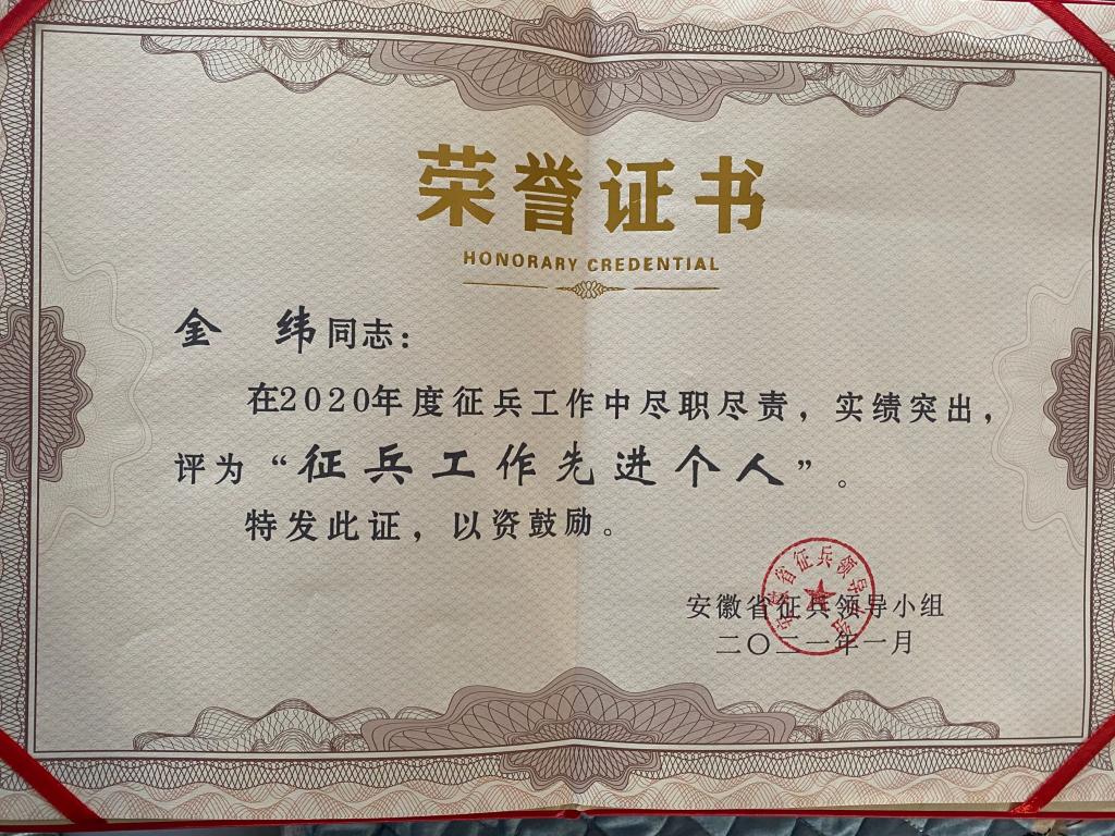 日前,安徽省征兵领导小组对2020年全省征兵工作先进单位和先进个人予以通报表扬,经遴选推荐,伟德官网武装部国防教育(征兵办公室)科长金纬同志荣获全省“征兵工作先进个人”荣誉称号。
