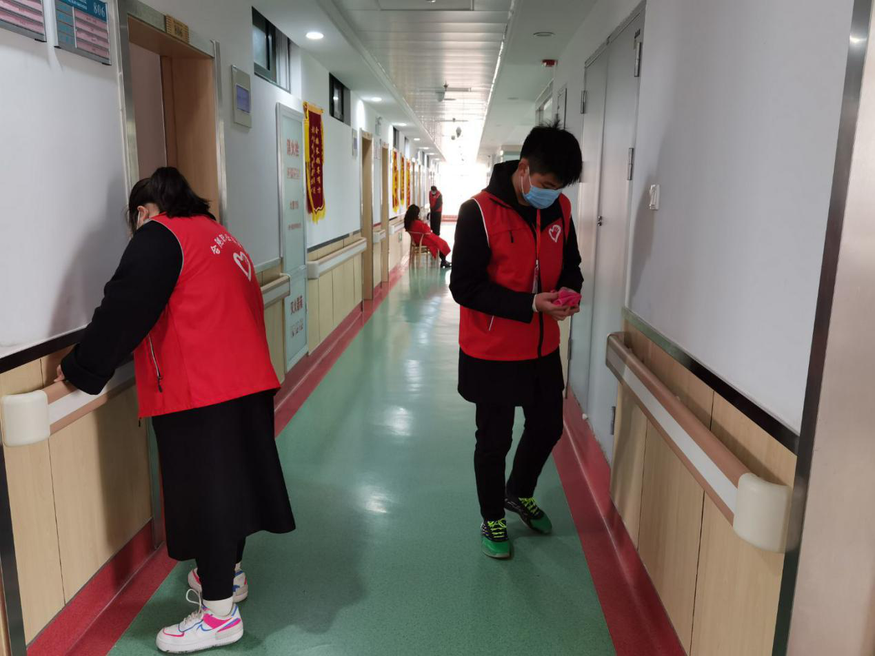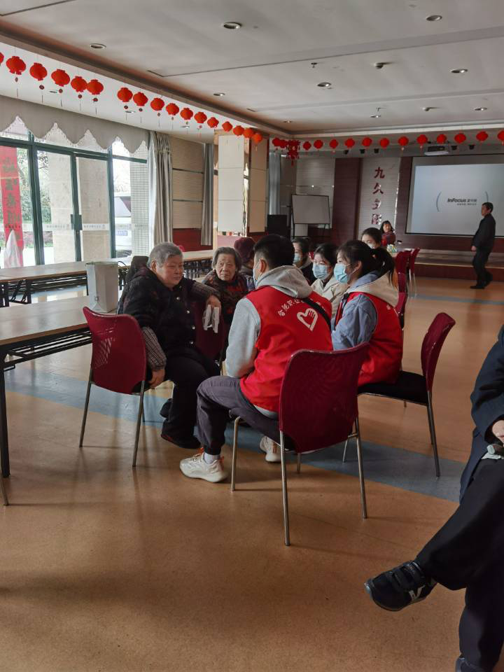 3月21日上午,由30名学生志愿者组成的青年志愿服务队分成两队在学长学姐和负责老师的带领下分别前往九久夕阳红老年城和磨店老年城。九久夕阳红老年城志愿者们到达后,由工作人员统一进行任务分工。每名志愿者各司其职,给老人按摩,陪老人聊天唱歌,帮助工作人员打扫卫生,清理窗台、衣柜及家电上的灰尘等等。有的志愿者还陪老人一起锻炼,一起散步。为老人们带去了充足的温暖,让老人们在安心养老之际充满快乐,感受到社会的温暖。九久组成员的两首合唱得到了老人们的掌声与欢笑,同时,两位老人的深情歌唱也更加活跃了现场的气氛。