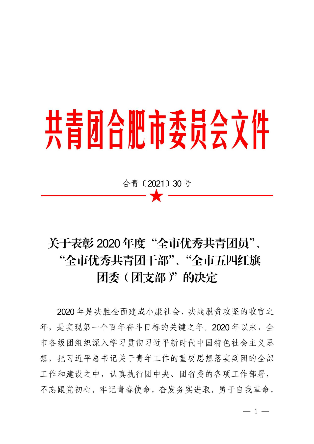 近日,共青团合肥市委下发《关于表彰2020 年度“全市优秀共青团员”、“全市优秀共青团干部”、“全市五四红旗团委(团支部)”的决定》文件,决定授予一批团员、团干部和团组织“合肥市优秀共青团员”、“合肥市优秀共青团干部”、“合肥市五四红旗团委(团支部)”等荣誉称号。