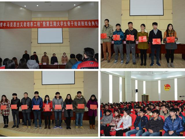 12月26日下午,我院“青年马克思主义者培养工程”第五期大学生骨干培训班结业典礼在图书馆二楼报告厅隆重举行。院党委副书记胡其云及宣传统战部、各系(分院)党总支负责人和“青马培训班”学员共200余人参加了结业典礼。典礼由院团委书记佘海月主持。