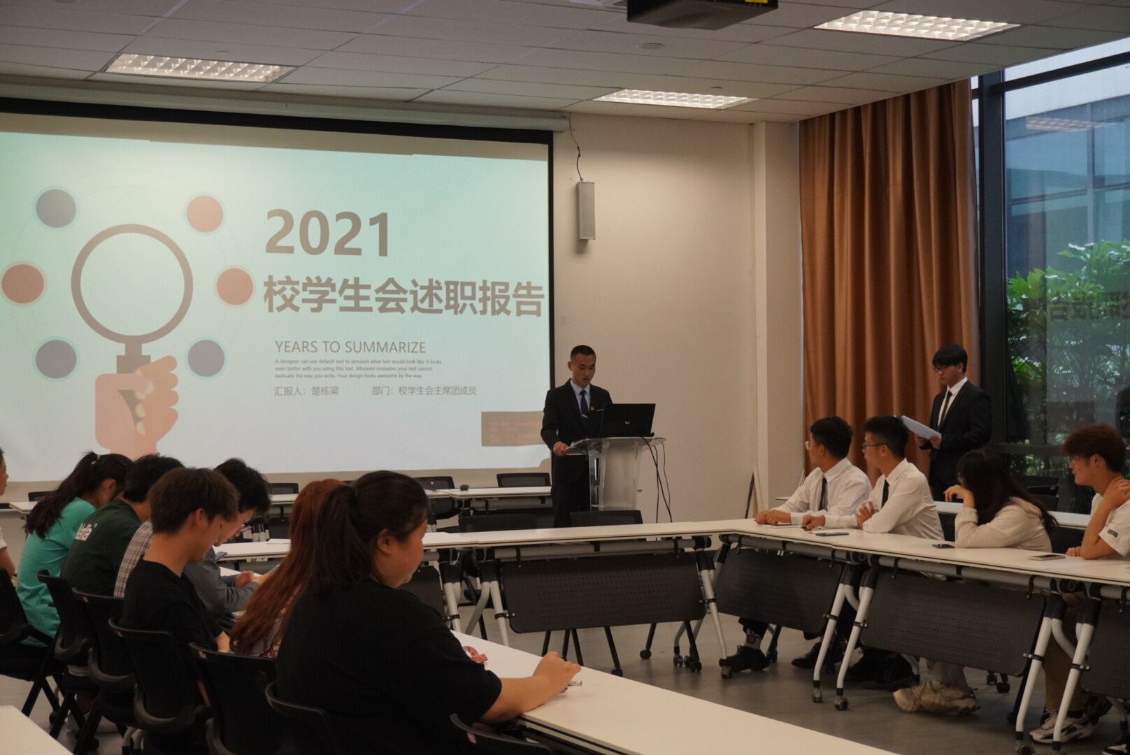 大会伊始,校学生会执行主席和8个二级学院学生会执行主席依次汇报了学生会本学期在深化改革、内部建设和服务同学等工作中取得的成绩,在主席团的带领下,校院学生会顺利举行了多项活动,例如:党史知识竞赛、“我为同学做件事”系列活动、跳蚤市场、志愿服务等活动。对于过去一年在组织改革、服务同学、校园活动等方面的工作进行了深入总结,同时也对工作时效性不强、计划性欠缺、创新性不足等问题进行了反思。并对下一步的工作提出设想,全心全意为同学服务,积极拓展新领域,开创新局面,做好“青春同路人”!