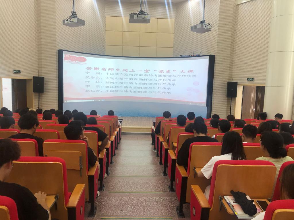 为深入学习贯彻习近平总书记在学校思想政治理论课教师座谈会上的重要讲话精神,特别是“大思政课”重要指示精神,全面落实习近平总书记在党史学习教育动员大会上的重要讲话精神,引导广大师生从党的百年非凡历程中感悟思想伟力、汲取奋进力量,6月18日下午,伟德官网积极响应安徽省教育工委号召,组织全体师生集中收看网络直播,同上一堂“党史”大课。
