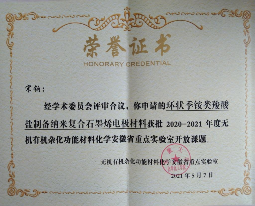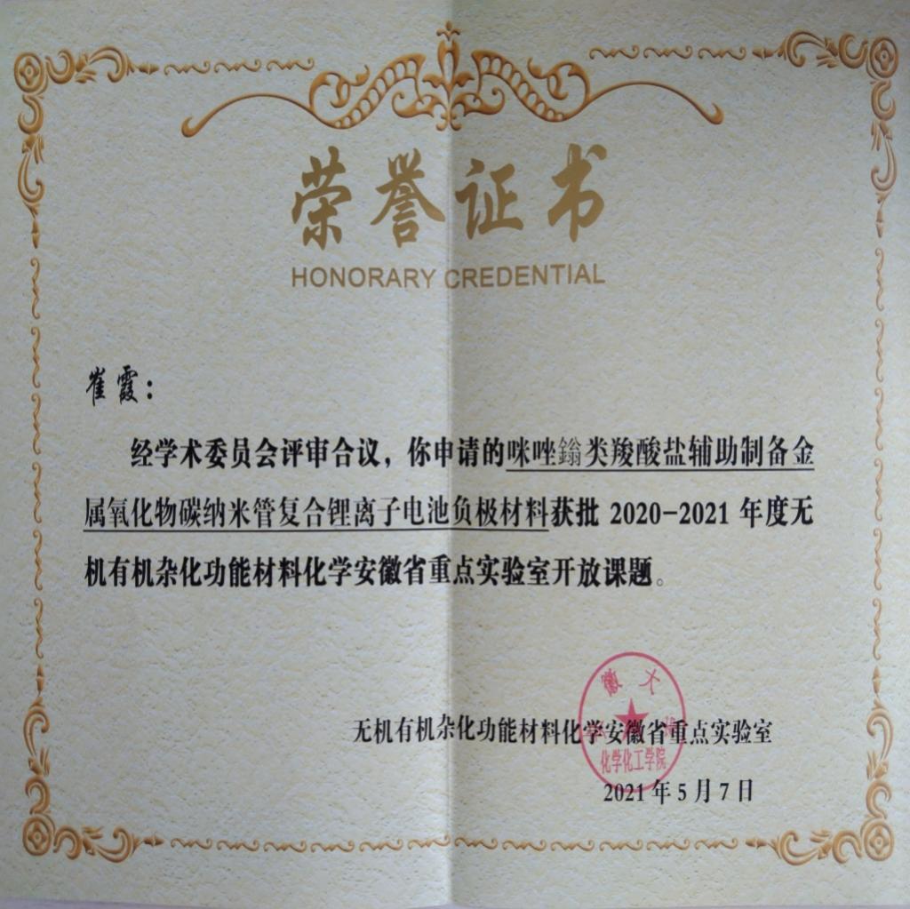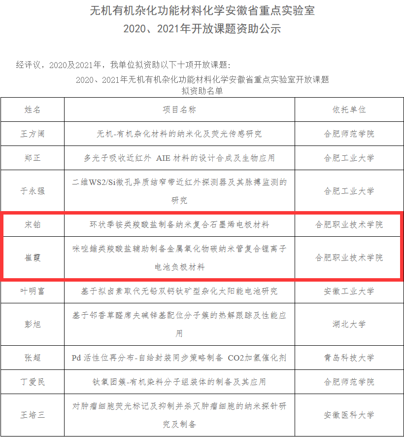 近日,据安徽省重点实验室通知,伟德官网博士后研究中心团队崔霞、宋铂两位老师申请的无机有机杂化功能材料化学安徽省重点实验室开放课题已获批,并获得立项资助,资助经费为4万元,课题将在2021年5月至2023年4月期间执行。伟德官网是本次立项开放课题唯一入围的职业院校。