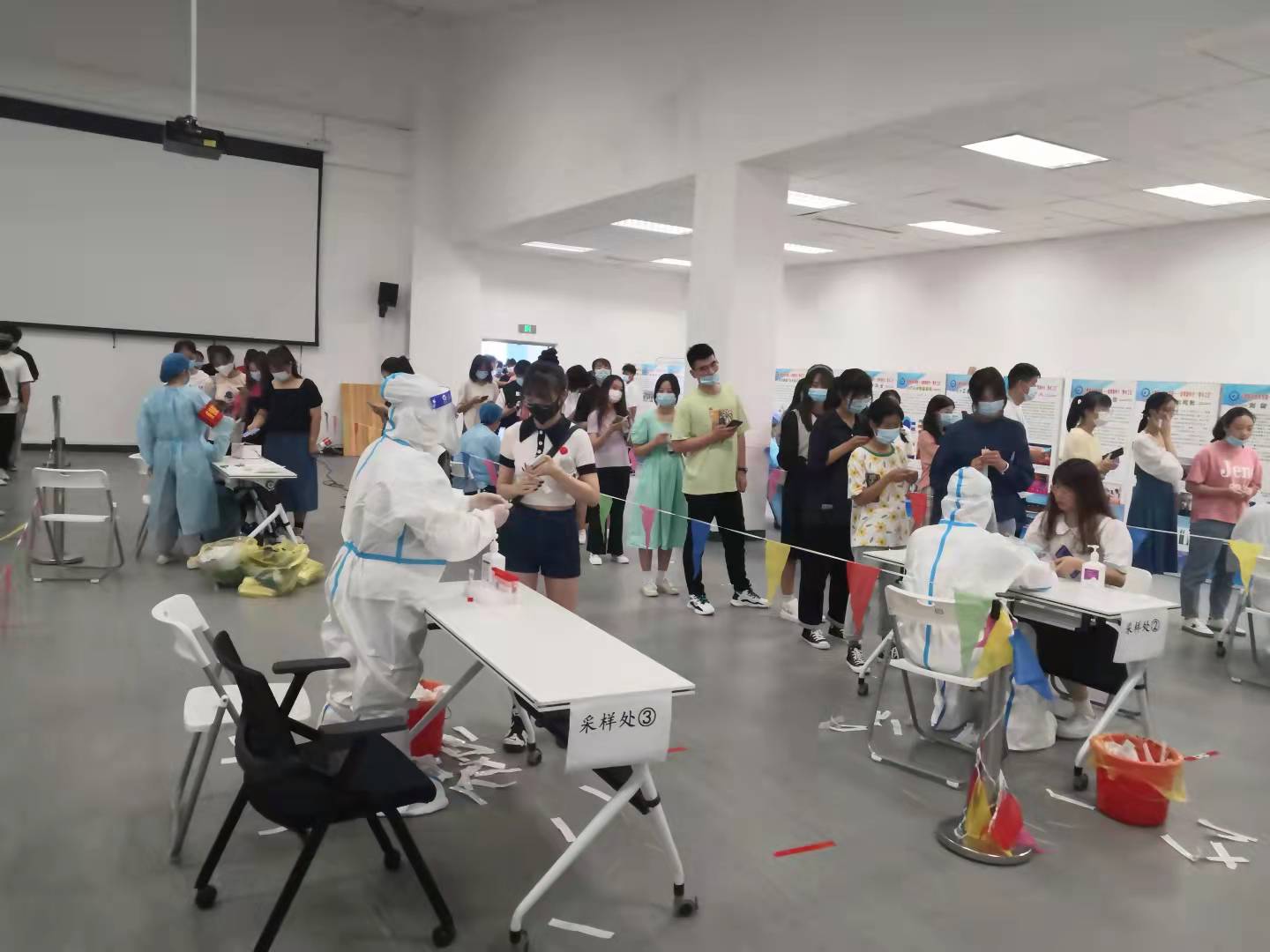 采样点严格按照要求设置进场等候区、身份核验区、核酸采样区等区域,采样期间师生全部佩戴口罩,保持间距,现场秩序井然,有条不紊。