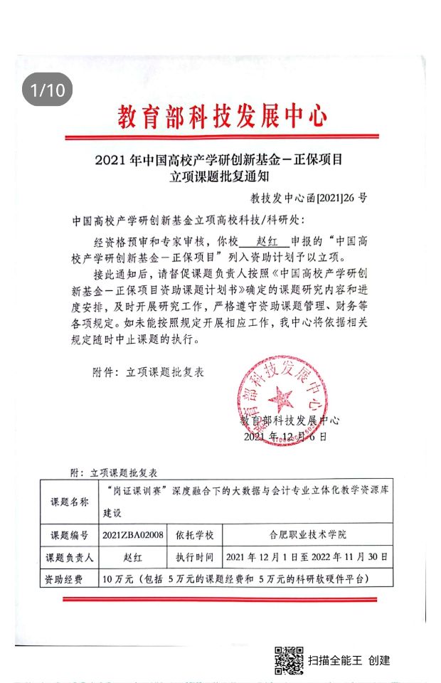 12月6日,2021年中国高校产学研创新基金立项名单正式公布,经贸旅游学院赵红教授的课题——“‘岗证课训赛’深度融合下的大数据与会计专业立体化教学资源库建设”获批立项。