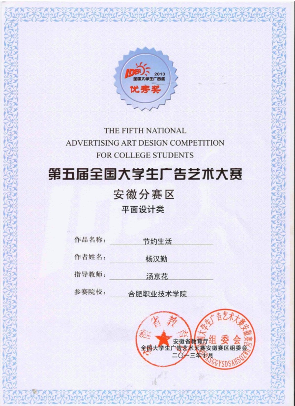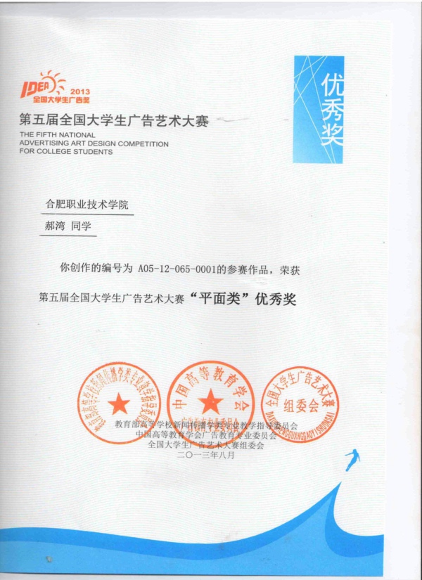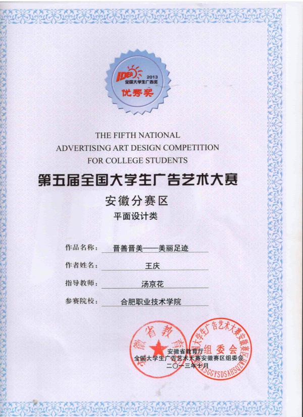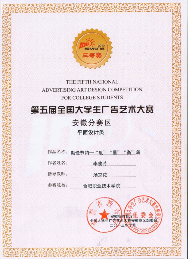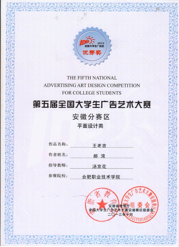 日前,我院广告与动漫专业学生参加第五届全国大学生广告艺术大赛,获得全国优秀奖1幅,省级三等奖1幅,省级优秀奖3幅的好成绩。