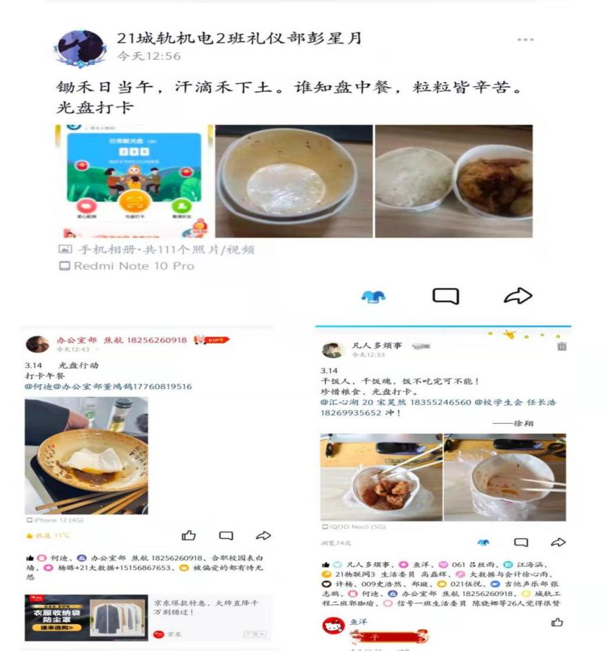 开展光盘行动志愿服务活动。为引导学生养成节俭的生活习惯,杜绝浪费,提高节约意识,构建节约型校园,校学生会面向全校同学开展“光盘行动”线上打卡志愿服务活动。不仅要光盘照片打卡,更是记录次数,通过这种方式促进同学们爱惜粮食习惯养成。本次打卡活动将持续到4月份,获得排名的学生更有精美纪念品一份。