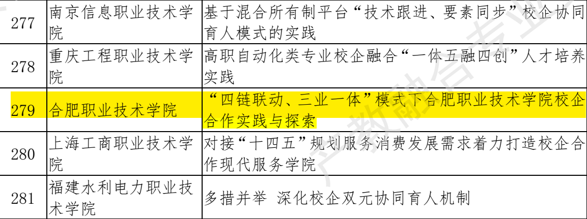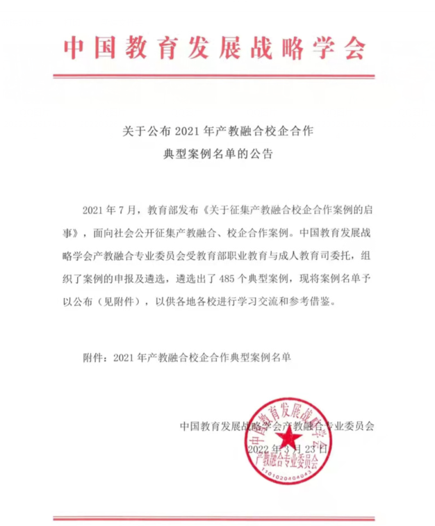 据悉,教育部职成司开展本次案例征集工作,旨在贯彻习近平总书记对职业教育的重要指示和全国职业教育大会精神,深化产教融合、校企合作,提高职业院校办学水平和人才培养质量。案例征集工作自2021年7月启动以来,共收到来自全国职业院校、行业企业申报的案例近2000个,经专家评审,共有485个案例入选教育部2021年产教融合校企合作典型案例。(供稿:科技处 编辑:杨璨)