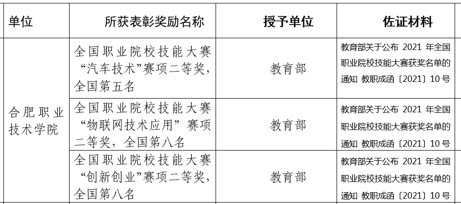 技能大赛砥砺奋进。2021年,学生在全国职业院校技能大赛中荣获二等奖3项;在安徽省职业院校技能大赛国赛选拔赛中获奖19项(一等奖8项、二等奖6项、三等奖5项);教师在安徽省职业院校技能大赛教学能力比赛中获奖5项(一等奖1项,二等奖1项、三等奖3项)。