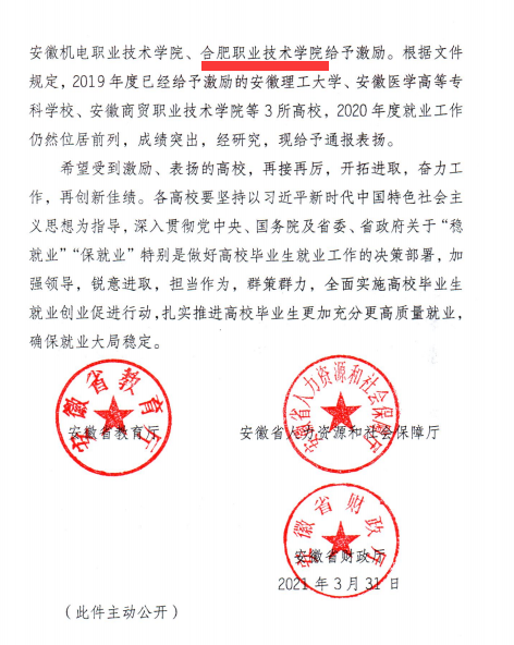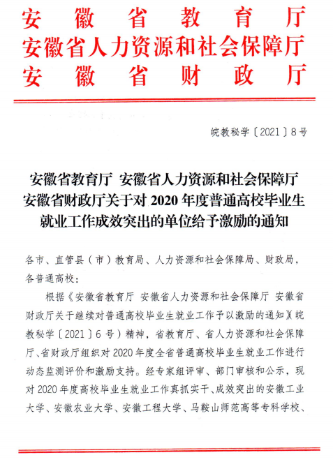就业工作再激励。学校立足合肥、面向安徽开展毕业生就业工作。2021届毕业生5109人,毕业生去向落实率97%以上,留肥率55%以上。2021年,学校被教育部批准为全国高校毕业生就业能力培训基地,被安徽省下文授予2020年就业工作受激励高校。2022年1月15日,在2022届全国普通高校毕业生就业工作第一次调度视频会议上,学校与河南省教育厅、四川省教育厅、陕西省教育厅、电子科技大学、中国政法大学、黑龙江大学先后作经验交流发言,校党委书记王杰才代表学校作《聚焦服务区域发展全力推动高质量就业》的主题汇报。
