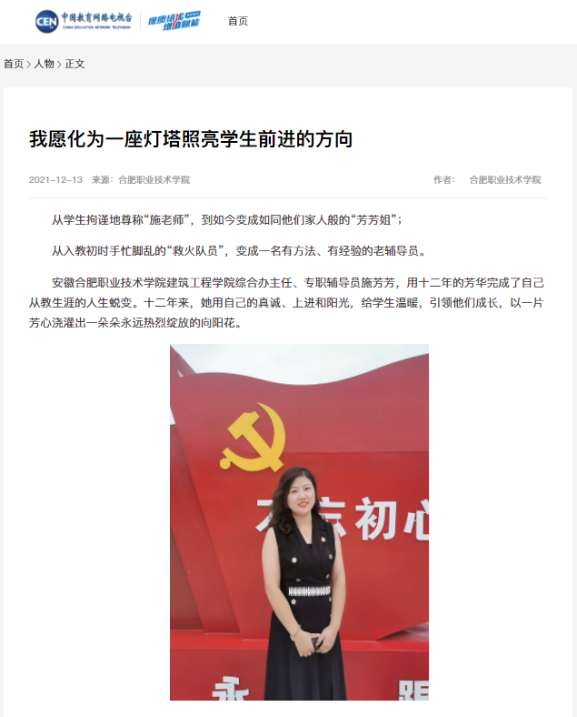 辅导员工作案例成功入选教育部提质培优增值赋能典型案例。2021年12月,伟德官网《我愿化为一座灯塔照亮学生前进的方向》案例从来自1103所职业院校和地方教育行政部门提交的3430个典型案例中脱颖而出,成功入选教育部2021年度职业教育提质培优增值赋能典型案例。伟德官网建筑工程学院持续探索“立足校企融合,传承‘徽匠精神’建筑类专业特色人才培养”的新路径,涌现出一批具有示范引领的教育教学管理人才,案例主角施芳芳老师就是其中杰出的代表。