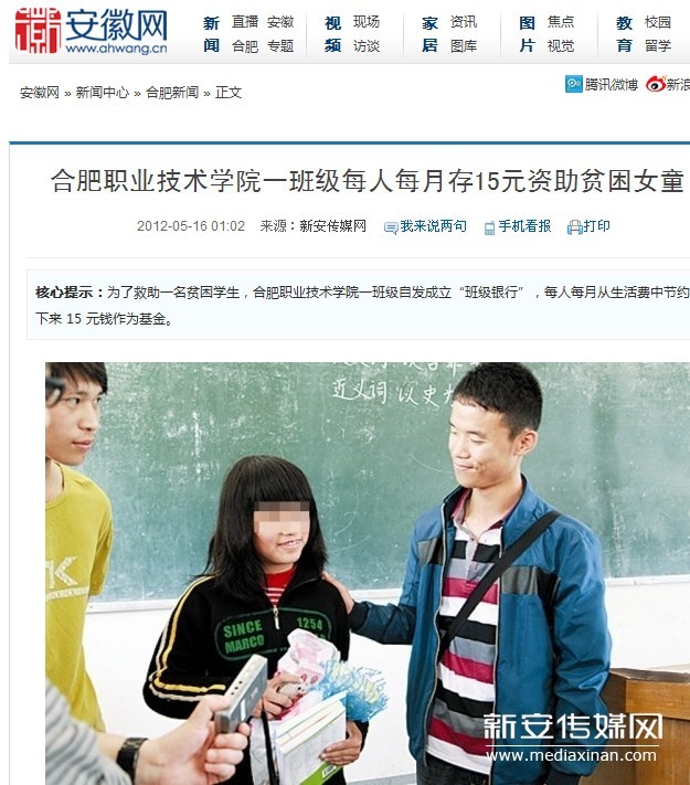我院的教育教学、招生就业工作引起了媒体的全方位关注。其中,合肥电视台报道了2012级新生军训、第一届运动会、计算机系学生的艺术设计作品展,安徽教育网报道了大学生创业大赛、大学生就业孵化中心、光明日报下属的光明网报道了我院新生入学等等。我院大学生思想政治教育的成果同样引起了媒体的特别关注,我院经贸系11级建筑装饰工程技术专业的同学们捐款资助长丰县贫困女童陈月霞的事迹引起了包括安徽教育网、安徽广播网、安徽法制网、中安在线、合肥在线等媒体的广泛关注,其中省内知名媒体《新安晚报》用了半个版面的篇幅报道了我院学生发起爱心捐款的详细情况。