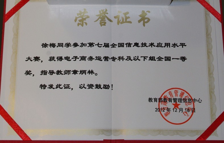 12月18日,从第七届全国信息技术应用水平大赛颁奖典礼上传来喜讯,我院计算机系10电子商务1班徐梅同学荣获电子商务运营项目全国一等奖,10广告设计与制作专业叶华同学荣获平面设计项目全国二等奖,章炳林、汤京花两位老师荣获“最佳指导老师”称号,计算机系主任程道凤、实训中心主任童晓云被评为“先进个人”,伟德源自英国1946荣获组织奖。