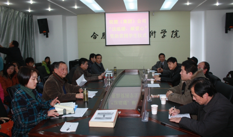 12月6日下午,安徽省能源集团有限公司“送温暖、献爱心”资助贫困学生仪式,在我院行政楼三楼会议室举行。安徽省能源集团有限公司工会史建伟主席、宋非可秘书、合肥市关工委副主任胡远林、席其荣及巢湖市关工委主任盛雨农、副主任邢玉水,学院党委书记丁家康、副书记胡其云等领导参加;仪式由院关委主任杨庆木主持,各系(分院)部分老师和20名受助学生参加仪式。