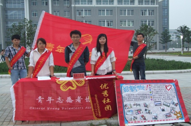 中午放学后,新生很快便被这里的社团宣传海报吸引,纷纷驻足观看,而社团的老会员们也向新生们分发传单,向新生介绍自己的社团,有的社团根据自己的特色,或是播放音乐,或是现场表演。新生们根据自己的兴趣爱好,寻找自己心仪的社团。各社团前来报名的新生络绎不绝,在这些社团中,青年志愿者协会是最受欢迎的社团之一。许多新生都希望在大学里能够为同学、为社会做出自己的贡献,而青协就为他们提供了这样的平台,许多热心公益的新生在这里聚集,以期实现他们的梦想。