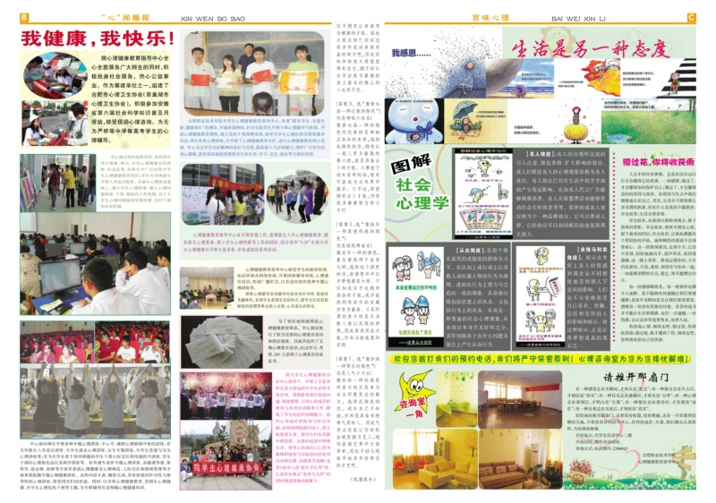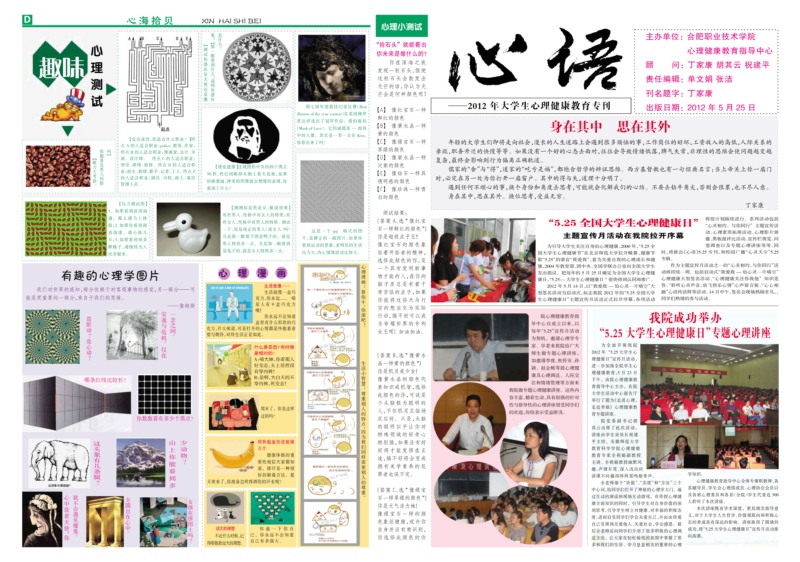 “心语”5.25专刊为同学们呈现了“‘心’闻播报”、“百味心理”、“心海拾贝”等版块,内容设计丰富多彩、生动活泼,采取学生喜闻乐见、图文并茂的形式,既宣传了学院心理健康教育工作,又普及了心理健康方面的知识。“心语”的问世,为我院心理健康教育搭建了又一平台。