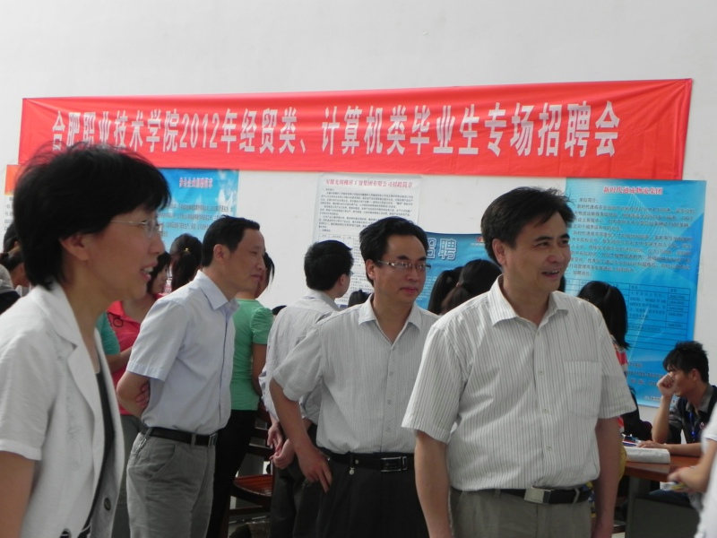6月1日下午,由我院主办,巢湖市人才交流中心、我院经济贸易系、计算机应用技术系承办的12届经贸类、计算机类毕业生专场招聘会在学院图书馆二楼大厅举行。院领导丁家康、方志斌、胡其云、金辉以及巢湖市人社局党组副书记钱扬政等领导亲临现场指导,看望用人单位代表并与他们进行了亲切的交谈。