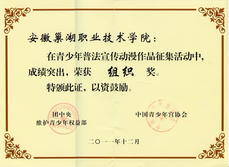 新春刚过,从青少年普法宣传动漫作品征集活动办公室传来喜讯,我院在2011年由团中央维护青少年权益部、司法部法制宣传司共同主办,中国青少年宫协会承办的青少年普法宣传动漫作品征集活动中获得了“组织奖”,送交的5件作品全部获得了优秀奖,4名教师获得了“指导奖”,优秀奖的作品同时获得了相应的物质奖励。