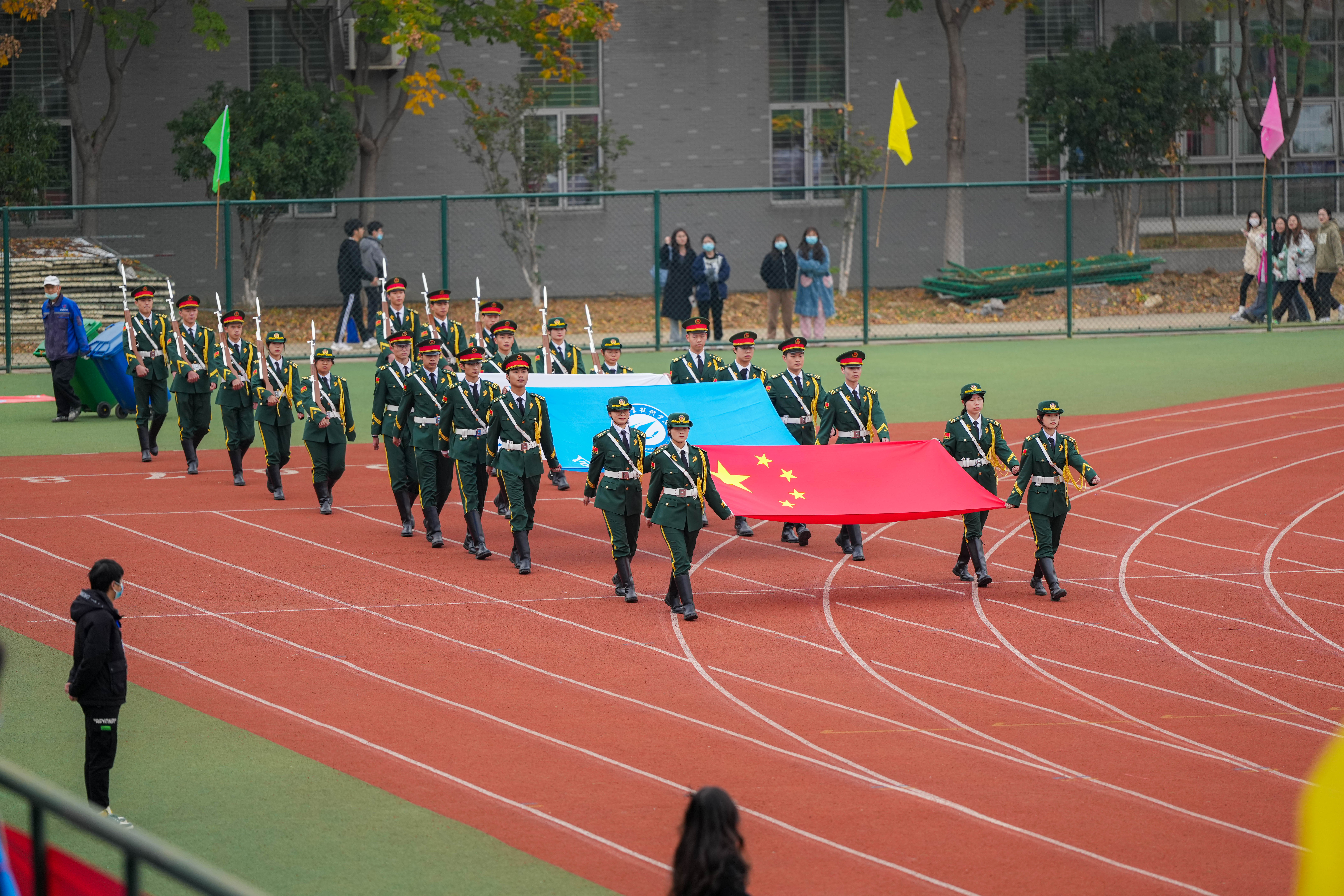 开幕式伊始,鲜艳的五星红旗和本届田径运动会校旗在校国旗护卫队护送下庄严入场。紧接着,由鼓山校区各二级学院带来节目表演,表演内容精彩纷呈,彰显出各二级学院的专业特色和体育文化内涵。随后,裁判员方队和各二级学院方队依次入场,同学们着装整齐,高喊口号、精神饱满,洋溢着青春的朝气,充分展现出合职学子积极向上的精神风貌。入场式结束后,雄伟庄严的《义勇军进行曲》响起,鲜艳的五星红旗冉冉升起,全体师生肃立,齐声高唱,歌声高亢,响彻校园。