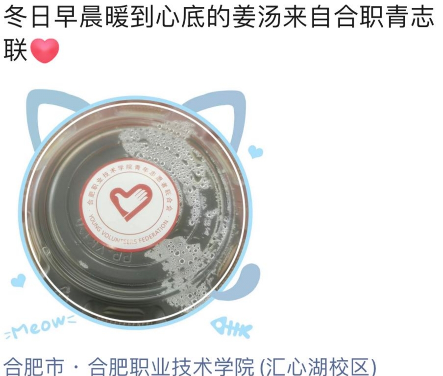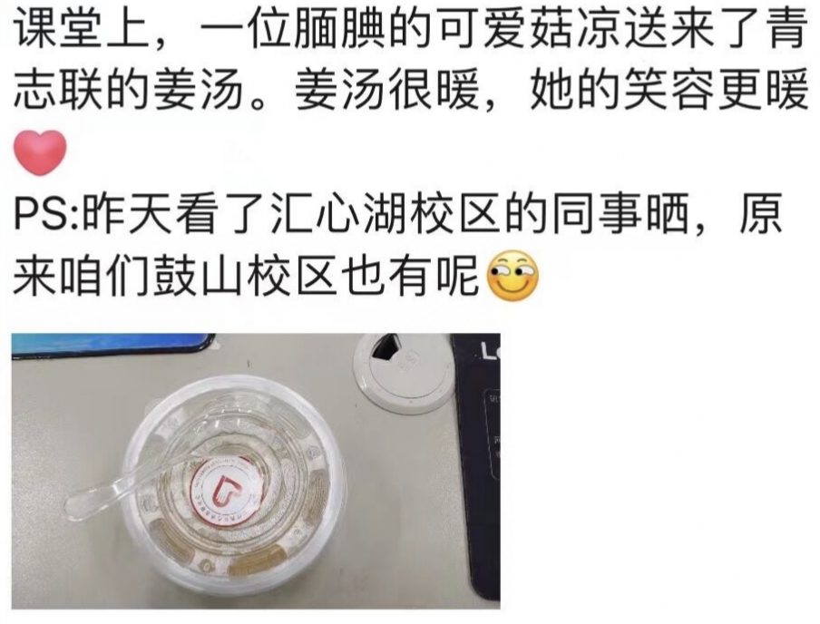 在看不见雪却丝毫不减其威力的寒冷冬天里,志愿者们穿上红马甲,并且真心地希望姜汤和围脖可以温暖不辞辛劳的每一位老师和后勤人员。愿志愿者们的微薄之力,能化作照亮校园的另一缕阳光,温暖校园的每一个角落,愿这个冬天的合职不太冷!(供稿:团委 编辑:杨璨)