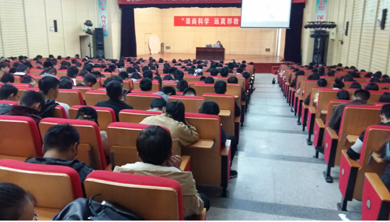 为了防范和抵制邪教组织对校园的渗透和蔓延,增强全院学生的反邪教意识,提高抵制邪教的能力,结合少数学生入学前家庭信教的影响,2016年11月10日下午,院学工部、宣传部和思想政治课教学部在院大学生活动中心联合举办《崇尚科学,远离邪教》主题讲座。此次报告会是在各在校班级进行了学生信教情况摸排统计、召开了关于信教问题的主题班会、编写了黑板报的基础上进行的,各班级团总支、班委会干部、寝室长、信教学生代表等近500名学生参加了听课。