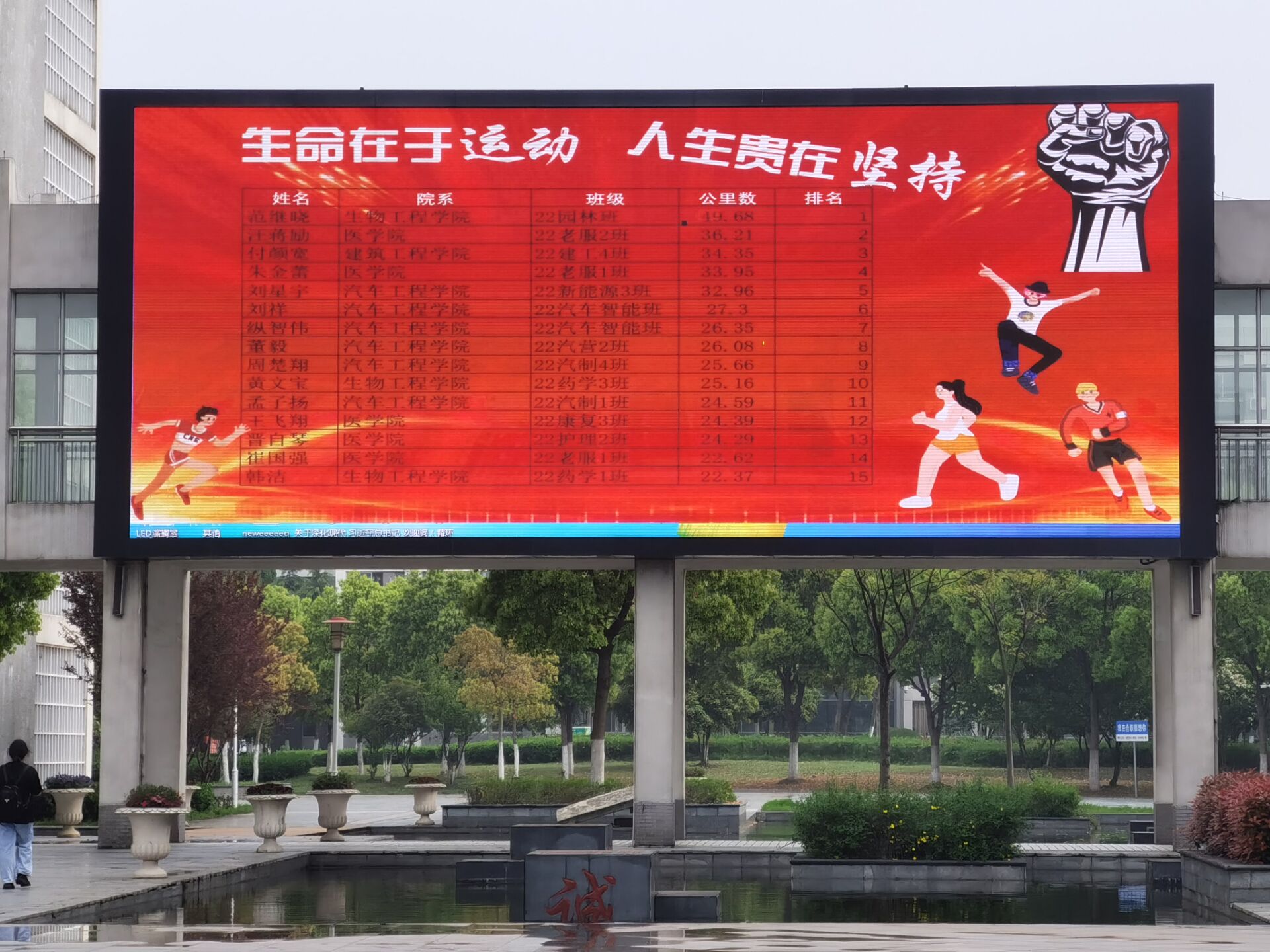 本次活动参与对象为两校区大一全体学生,截至4月20日上午十点,实际参与且取得有效里程数的人数已达到3545人,实际参与率为87.42% 。其中医学院学生参与率最高,达到95.20%;生物工程学院次之,参与率为89.80%;机电工程学院参与率排名第三为87.21%。据后台数据统计,仅开跑前三天总有效里程就突破10243.69公里,该活动将持续至6月中旬。根据《伟德源自英国1946健身跑实施方案(试行)》,对于完成要求的同学,将会在其体育成绩中占比30%的体育习惯一栏给予相应分值。同时,两校区定期通报参与率及排名情况,学期总公里数各前30名的同学分别给予通报表彰,并颁发荣誉证书。