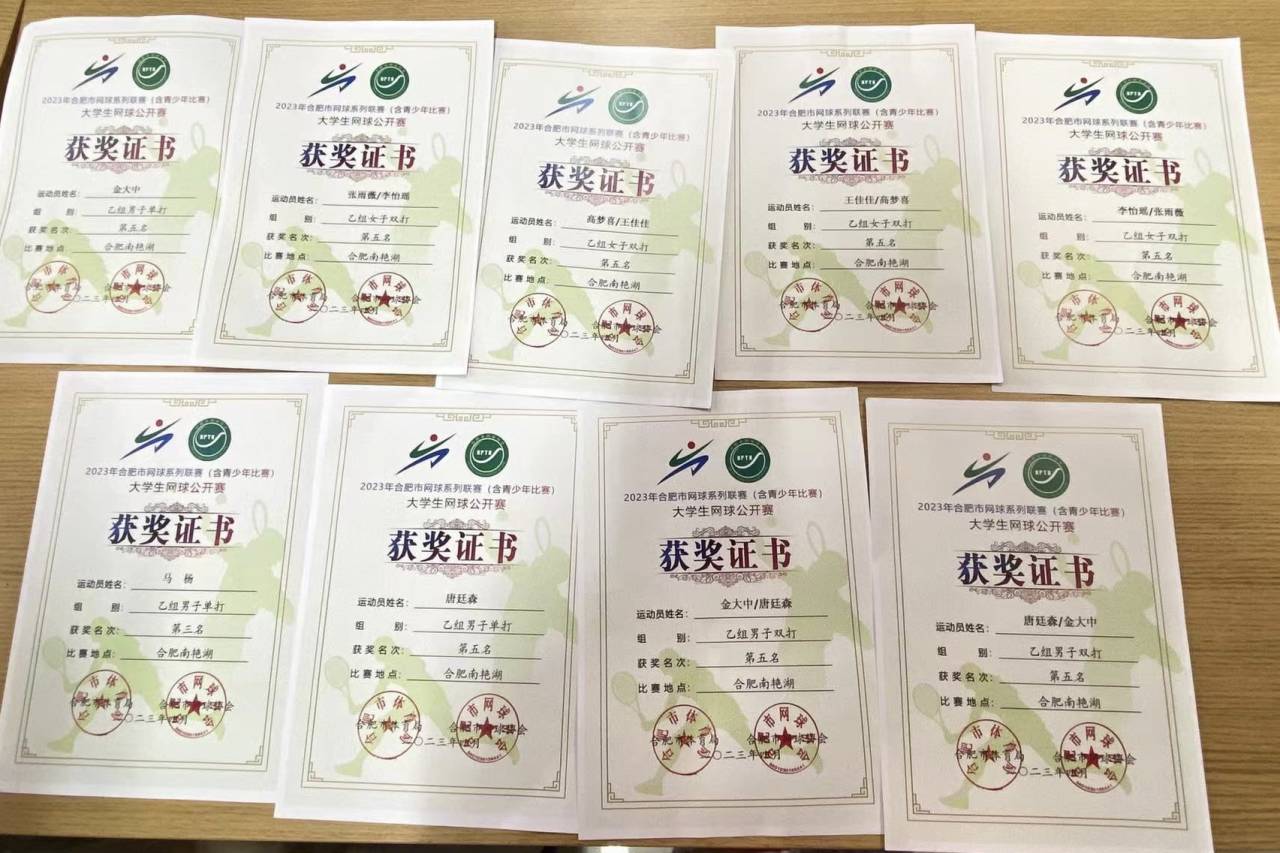 2023合肥大学生网球公开赛于4月22日至24日在南艳湖全民健身中心网球馆举行。伟德官网由基础教育学院副院长(主持工作)胡心红担任领队,朱浩、王丽水两位老师作为教练员,由5男5女共10人组成的网球代表队参加了本次比赛。经过三天的紧张激烈的比赛,队员积极向上,勇于拼搏,最终不负所望获得了乙组男子单打第三名(马杨)、两个男子单打第五名(唐廷森、金大中)、乙组男子双打第五名(唐廷森/金大中)和两个女子双打第五名(高梦喜/王佳佳、张雨薇/李怡瑶)的佳绩。
