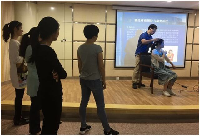 黄俊首先讲解教师职业病的类型及成因,使参会人员对教师职业病有了全面的了解;随后黄俊针对在教师职业病中具有较高发病率的颈椎病和腰椎间盘突出两大病症进行了重点介绍,分别从发病原因、发病症状、预防与治疗等方面作详细讲解,既专业又通俗易懂;最后黄俊同与会教职工进行了热烈的交流和现场诊治。
