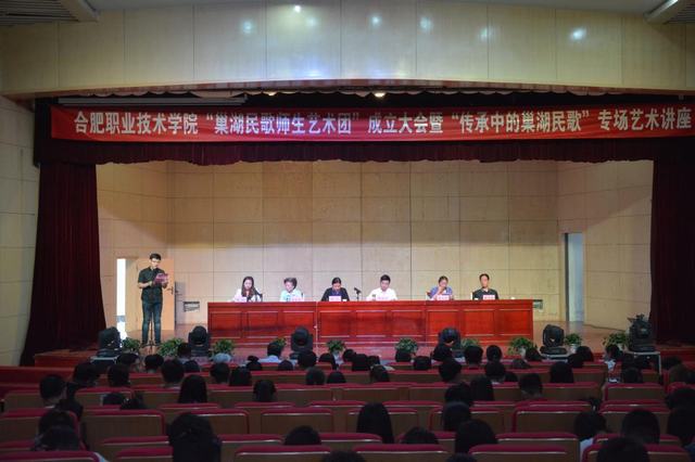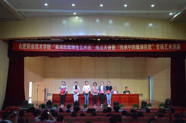 6月6日下午,“巢湖民歌师生艺术团”成立大会暨“传承中的巢湖民歌”艺术讲座在我院大学生活动中心礼堂如期举行,学院党委副书记胡其云、巢湖市文广新局主任科员曹本霞、巢湖民歌省级传承人李家莲、巢湖民歌研究会会长蔡善康及相关部门负责人出席大会。各系部(分院)约400名学生参加大会并聆听讲座,大会由团委副书记邹坤主持。