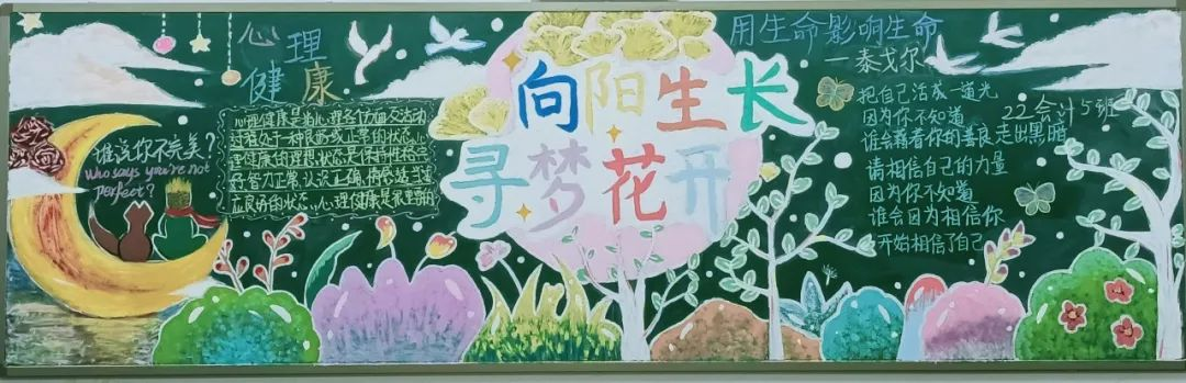黑板报,齐分享。通过设计主题黑板报,各班级进行了心理健康教育知识的宣传,引导学生用积极的心态去面对困难时刻,着力创建良好的班级和学校环境,引导全体学生保持昂扬的精神状态,增强心理免疫力,树立健康的学生形象,凸显当代学生的青春活力。