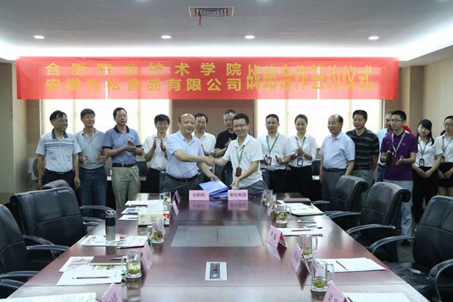 2017年7月7日上午,我院与安徽青松食品有限公司战略合作协议签约仪式在青松集团六楼会议室举行。学院副院长周晓隆与青松集团办公室主任陈明山签署校企战略合作协议,院党委书记罗兆好出席签约仪式,与青松集团董事长林松共同为“安徽省校企合作示范基地”揭牌。