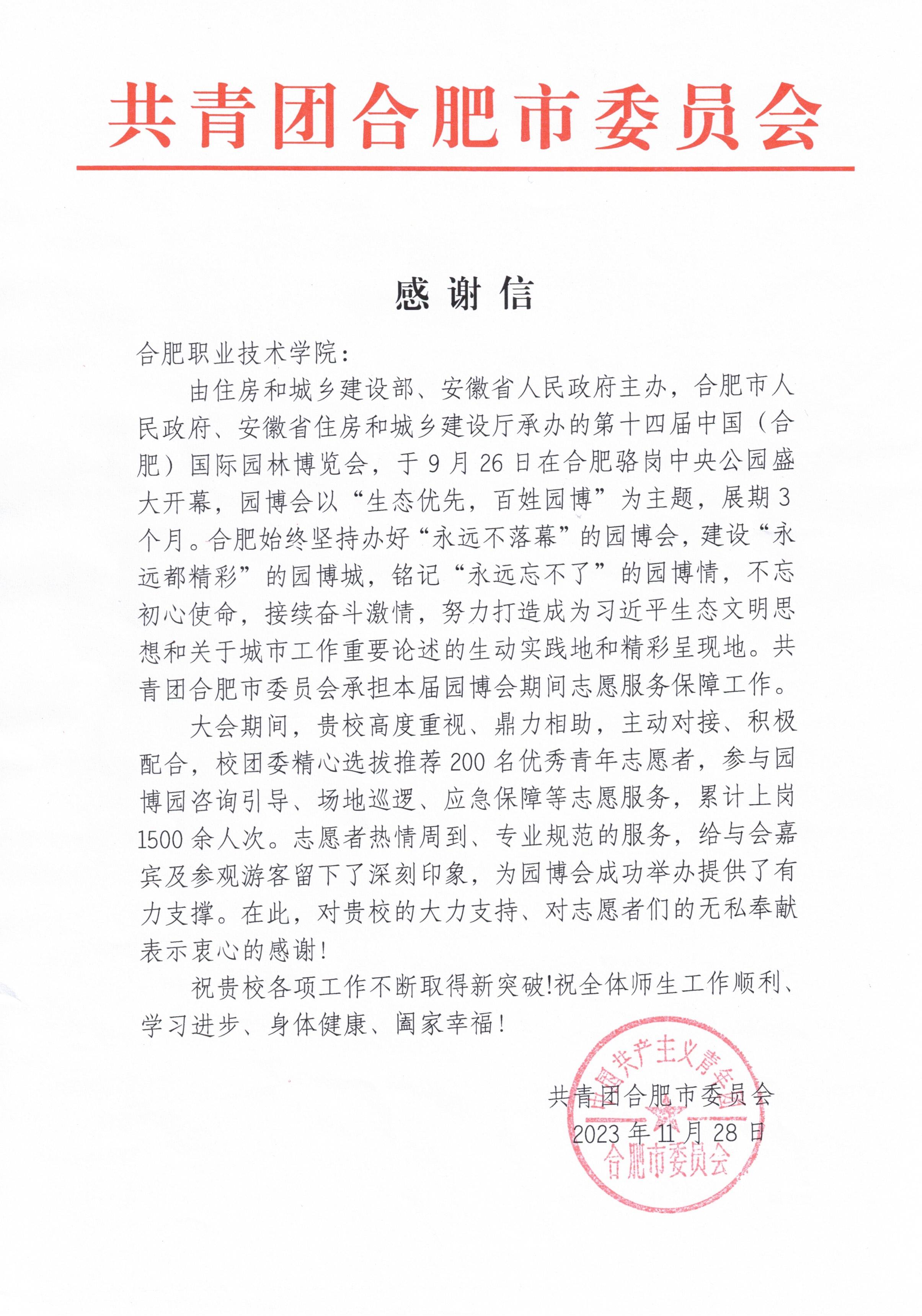 12月26日上午,历时3个月的第十四届中国(合肥)国际园林博览会圆满落幕。园博会期间,校团委精心选拔推荐200名优秀青年志愿者,参与园博园咨询引导、场地巡逻、应急保障等志愿服务,累计上岗1500余人次。活动结束后,共青团合肥市委发来感谢信,信上对伟德官网青年志愿者热情周到、专业规范的服务和无私奉献的精神予以充分肯定,对伟德官网的大力支持表示感谢。