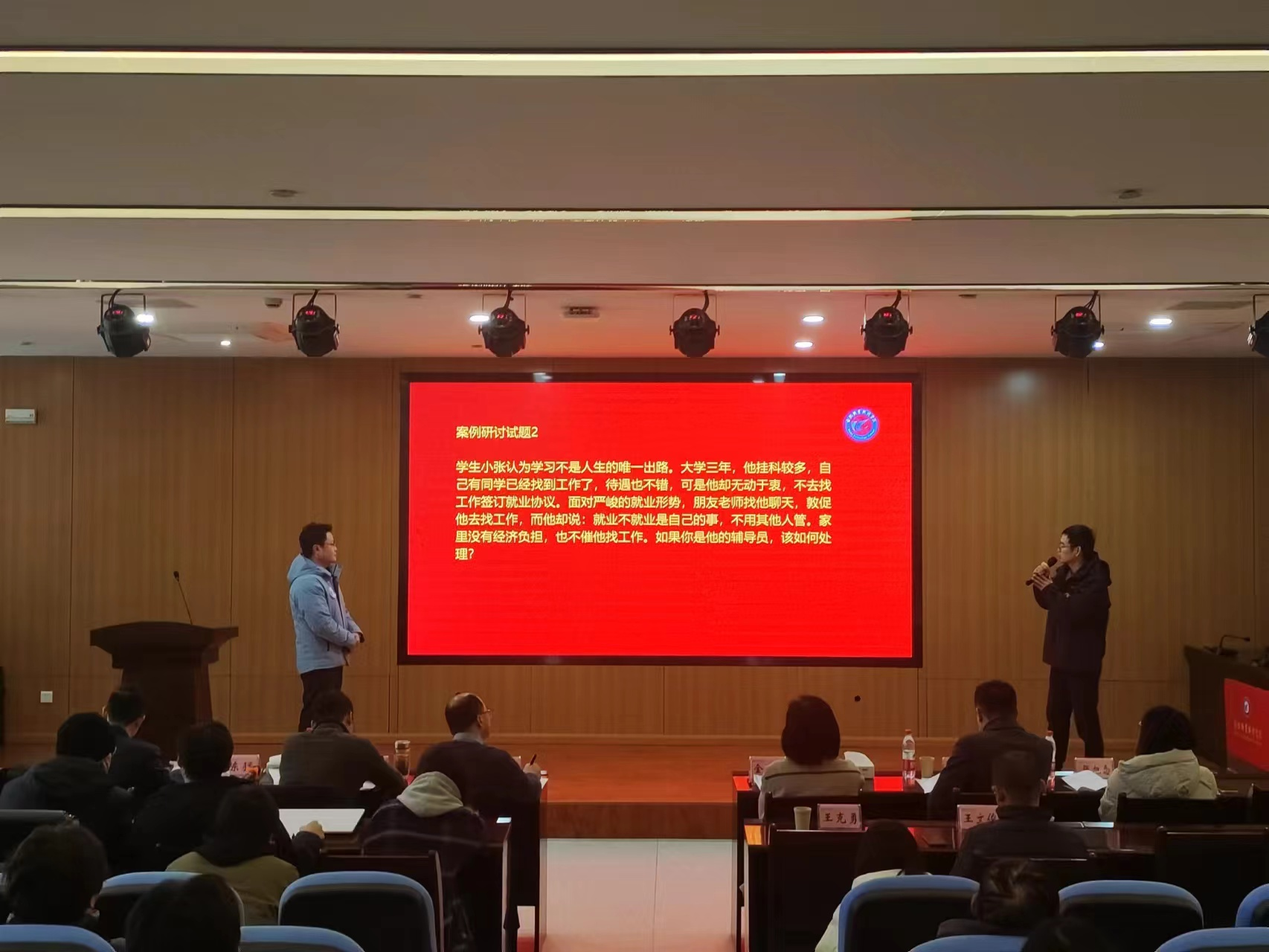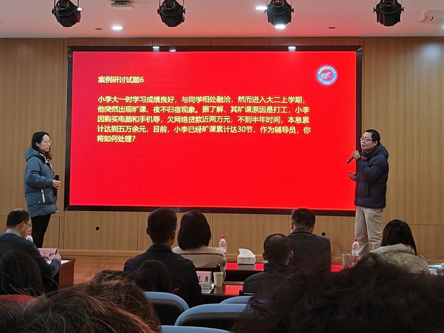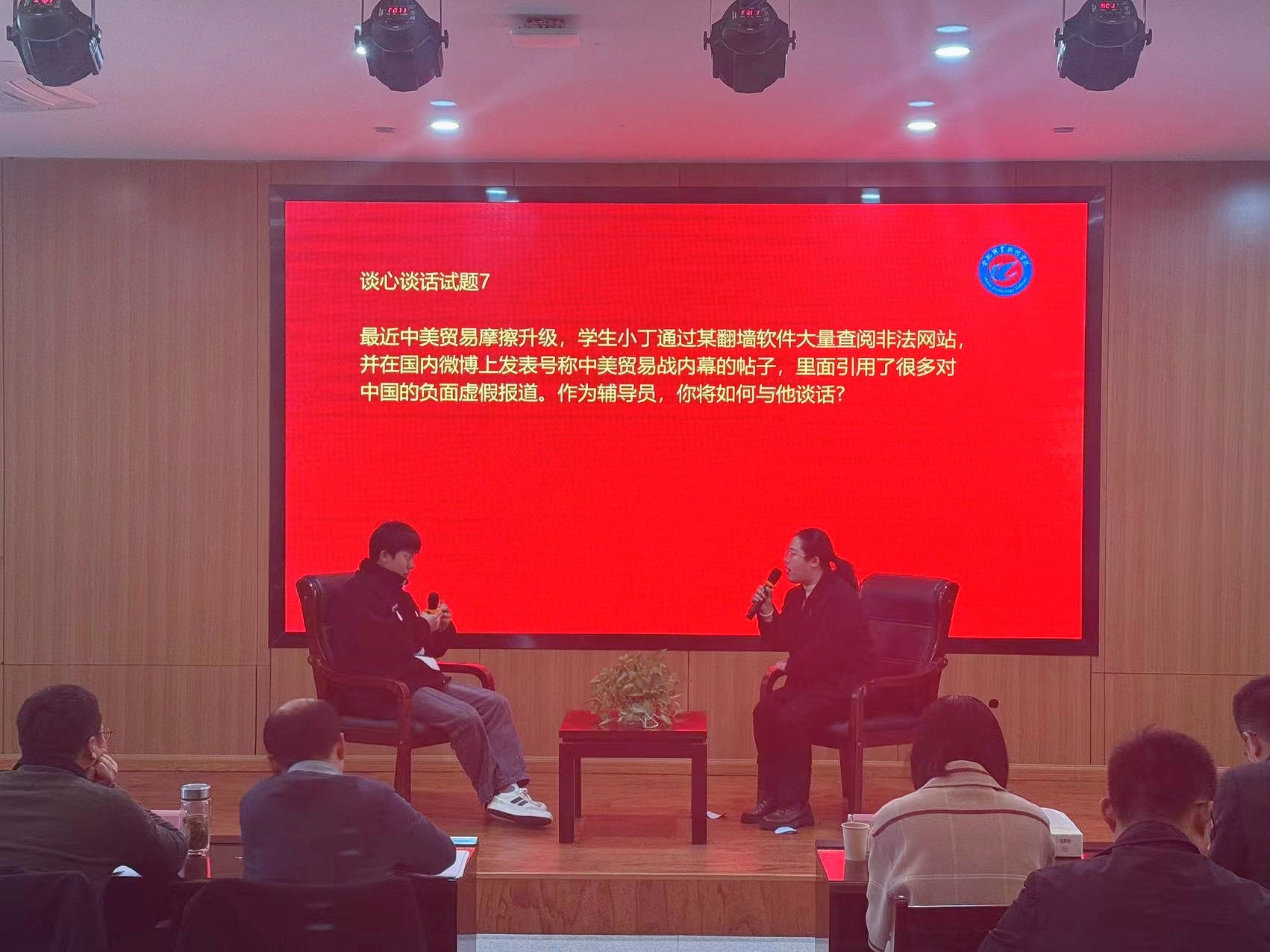 本次大赛分为二级学院初赛和校赛决赛两个环节。赛事启动以来,各二级学院广泛宣传,精心组织,辅导员们积极报名参赛,经过初赛选拔和学院推荐,共有10名专职辅导员脱颖而出进入校赛。校赛围绕案例研讨、谈心谈话两个环节展开。案例研讨环节,每组2名选手以“我提问,你回答”的方式开展,在有限时间内共同辨析原因、研讨对策、总结规律;在谈心谈话环节,选手与“学生演员”开展对话,以春风化雨的方式教育引导学生,帮助学生解决理论困惑与实际问题。
