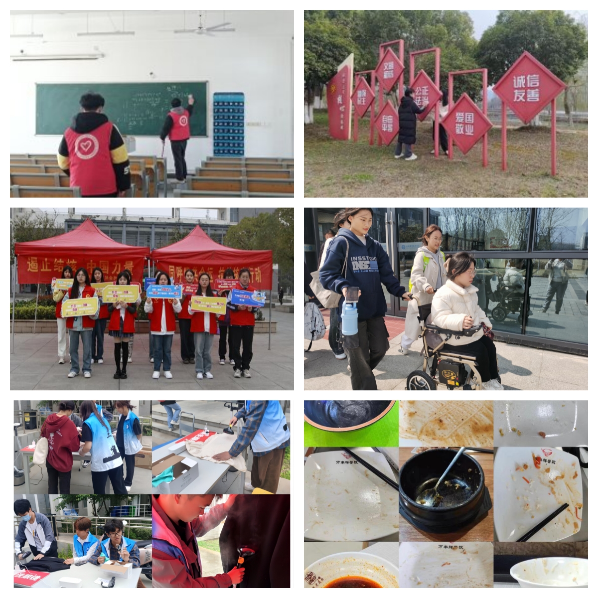 各学院、志愿服务组织纷纷开展校园清扫志愿服务活动,对校园卫生死角、指路牌、校园雕塑等进行了细致的清洁,创造了干净整洁的校园环境。积极践行“我为同学做实事”,建筑工程学院从小事做起,从实际出发,持续开展“风雨无阻 周三有我”志愿服务活动和“合力”搬迁志愿服务,帮助学生解决生活中的困难;信息工程与传媒学院发起关爱残疾学生活动,不同专业、不同年级的同学,以班级为单位或自发组织,帮助身边有残疾的同学,让她们感受学校的温暖;医学院学而社康复之家、天使护理协会结合专业所长开展学雷锋主题志愿服务活动,传播结核病防治知识,普及健康知识;医学院、生物工程学院开展“光盘行动”,提醒大家珍惜粮食,厉行节约。广大学生志愿者在志愿服务实践中奉献爱心、服务他人,让雷锋活动融入日常、化作经常。