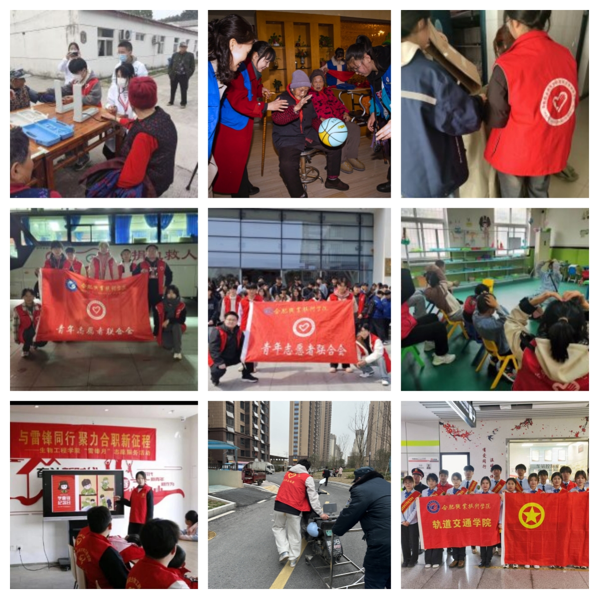 为更好地弘扬雷锋精神,实践雷锋服务于社会的品质,各学院、志愿服务组织积极拓展志愿服务平台,走进附近社区,有目的、有计划地组织开展种类多样地志愿服务活动。校青年志愿者联合会常态化开展助残、敬老、宿舍、献血等爱心系列志愿服务;医学院、建筑工程学院、汽车学院志愿者服务队分别走进巢湖市老吾老养老院、九久夕阳红护理院开展关爱老人志愿服务活动;机电工程学院志愿服务队走进磨店社区蔡岗社居委开展学雷锋志愿服务活动,帮助整理停放电瓶车及进行社区清扫;生物工程学院、信息工程与传媒学院、轨道交通学院志愿服务队分别走进歫嶂社区悦书房·紫薇书苑、蓝之天儿童康复中心、烈山路小学开展“大手拉小手”志愿服务活动;此外,轨道交通学院志愿服务队依托学科专业特色,与合肥轨道“科大区域站”进行密切合作,开展安检扫描、站台接发等志愿服务活动。合职学子全面深入学习雷锋同志全心全意为人民服务的无私奉献精神,为社会发展奉献合职青春力量,让学雷锋、做雷锋行动蔚然成风。