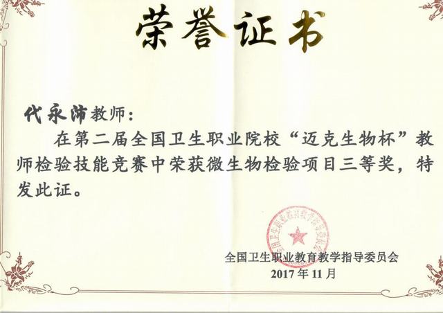 11月11日至14日,第二届全国卫生职业院校教师检验技能竞赛在重庆市举行。此次竞赛由全国卫生职业教育教学指导委员会主办,卫生行指委医学检验技术分委会、重庆医药高等专科学校承办,全国共27个省(市、自治区)的86所职业院校组队参赛,共有162名教师参加。伟德官网医学院派出杨娜娜和代永沛两位年青老师参赛,经过3天的紧张激烈的角逐,杨娜娜老师荣获一等奖、代永沛老师荣获三等奖。