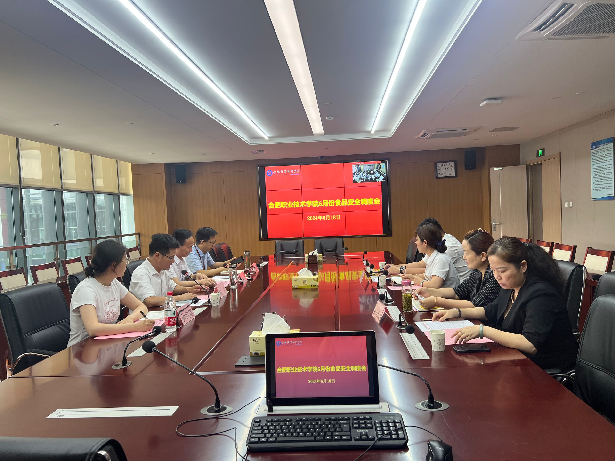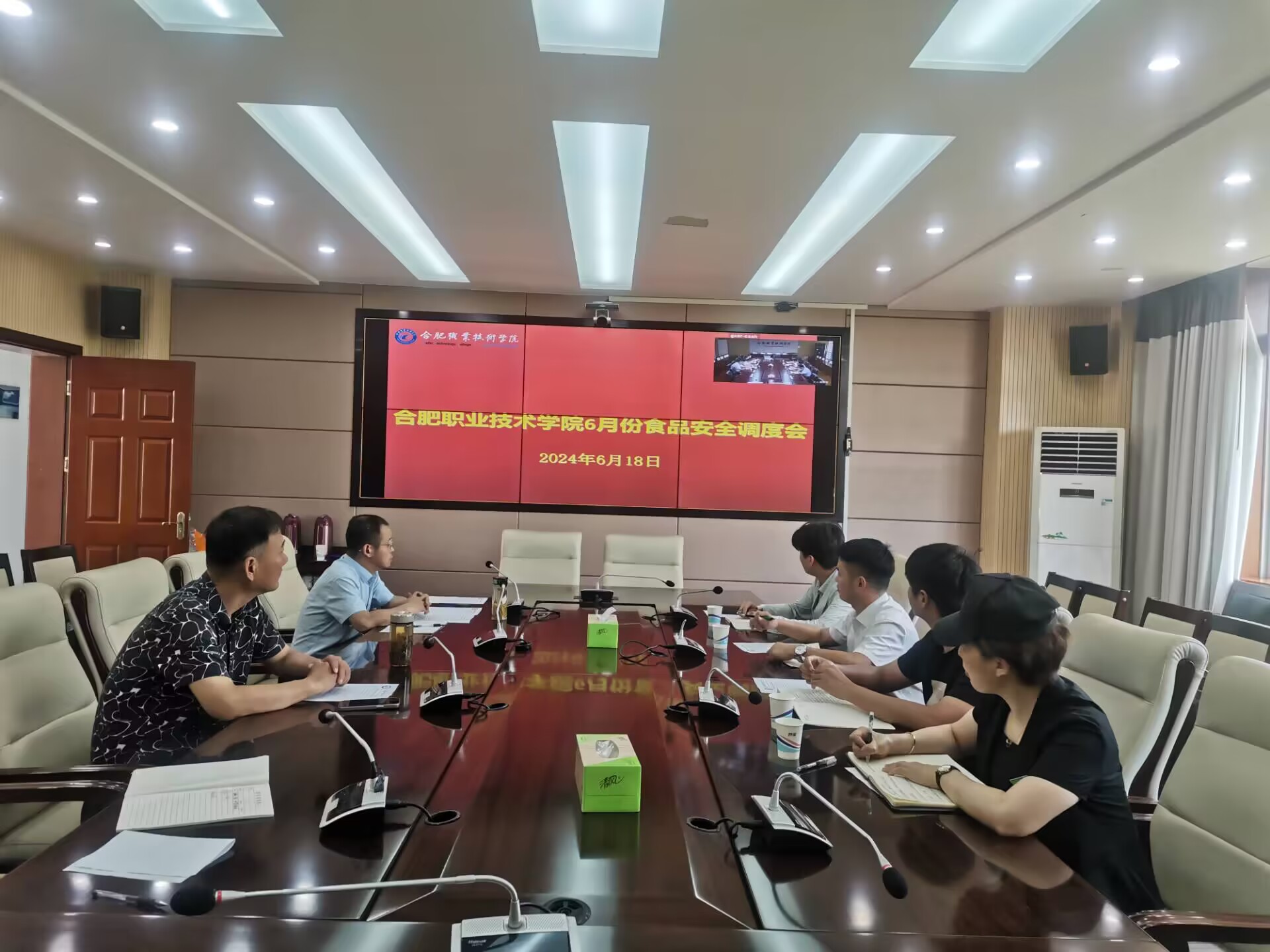 6月18日下午,伟德官网在两校区会议室召开6月份食品安全工作现场视频调度会。校长檀明、副校长王海及总务处相关科室负责人,校内食堂经营单位食品安全总监及食品安全员、项目经理参加会议。会议由总务处处长林胜主持。