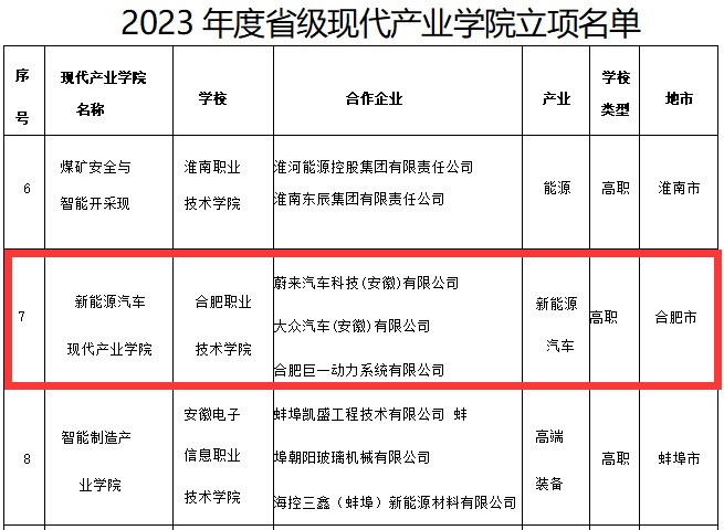 日前,安徽省教育厅正式公布“2023年度省级职业院校现代产业学院”立项名单,伟德官网联合蔚来汽车科技(安徽)有限公司、大众汽车(安徽)有限公司 、合肥巨一动力系统有限公司申报的“新能源汽车现代产业学院”成功获批。