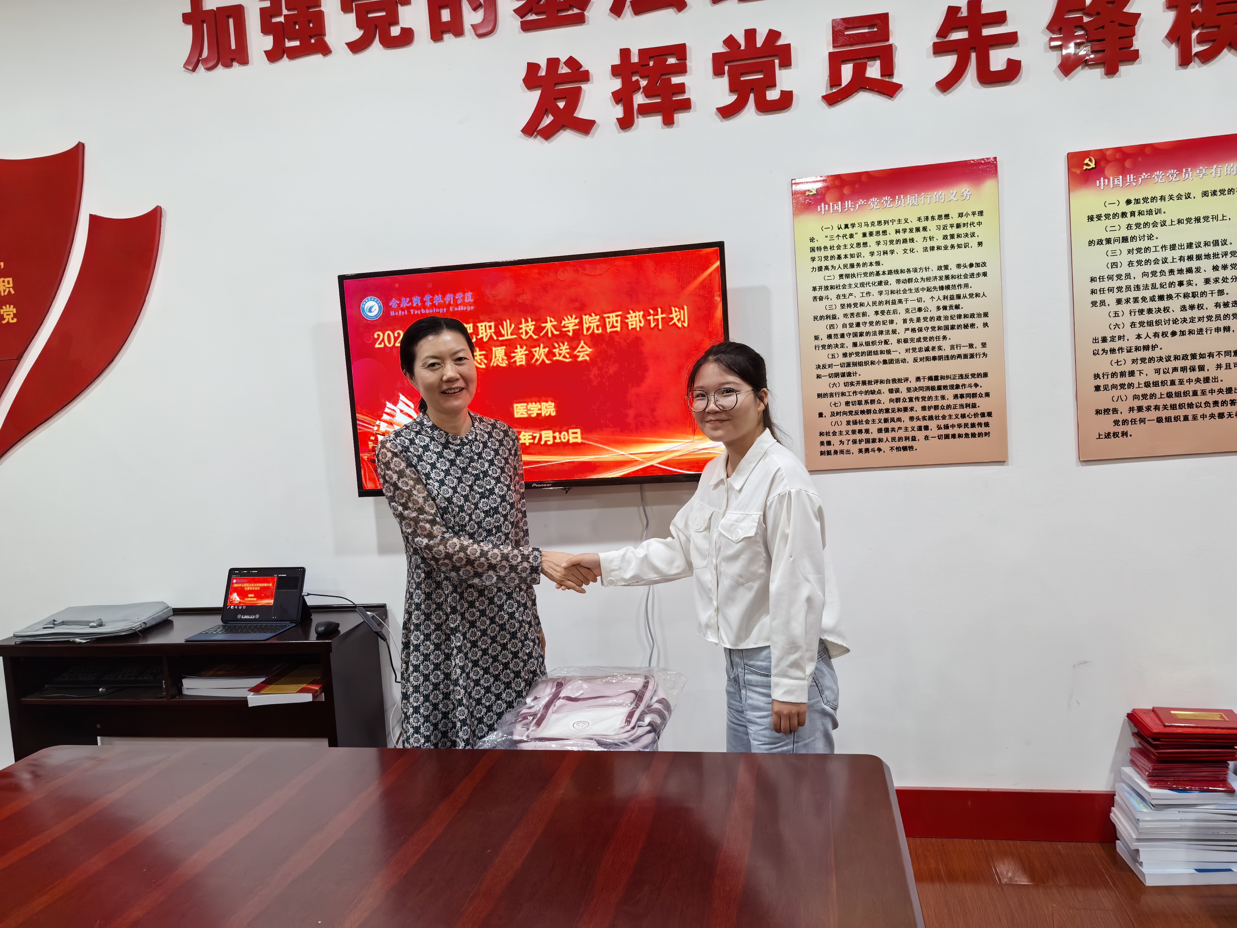 为欢送臧罗兰同学,表彰其在校期间及本次选拔中的优异表现,同时鼓励引导更多合职青年学子投身西部、扎根基层,在为人民服务中实现个人理想和价值,7月10日,伟德官网在鼓山校区医学楼会议室召开了2024年西部计划志愿者欢送会。校党委副书记金飞燕,鼓山校区党工委书记、管委会主任谭连生,学生处处长王克勇,校团委副书记赵倩倩来到现场,欢送会由医学院党总支副书记(主持工作)邹华兵主持,医学院相关人员参加。